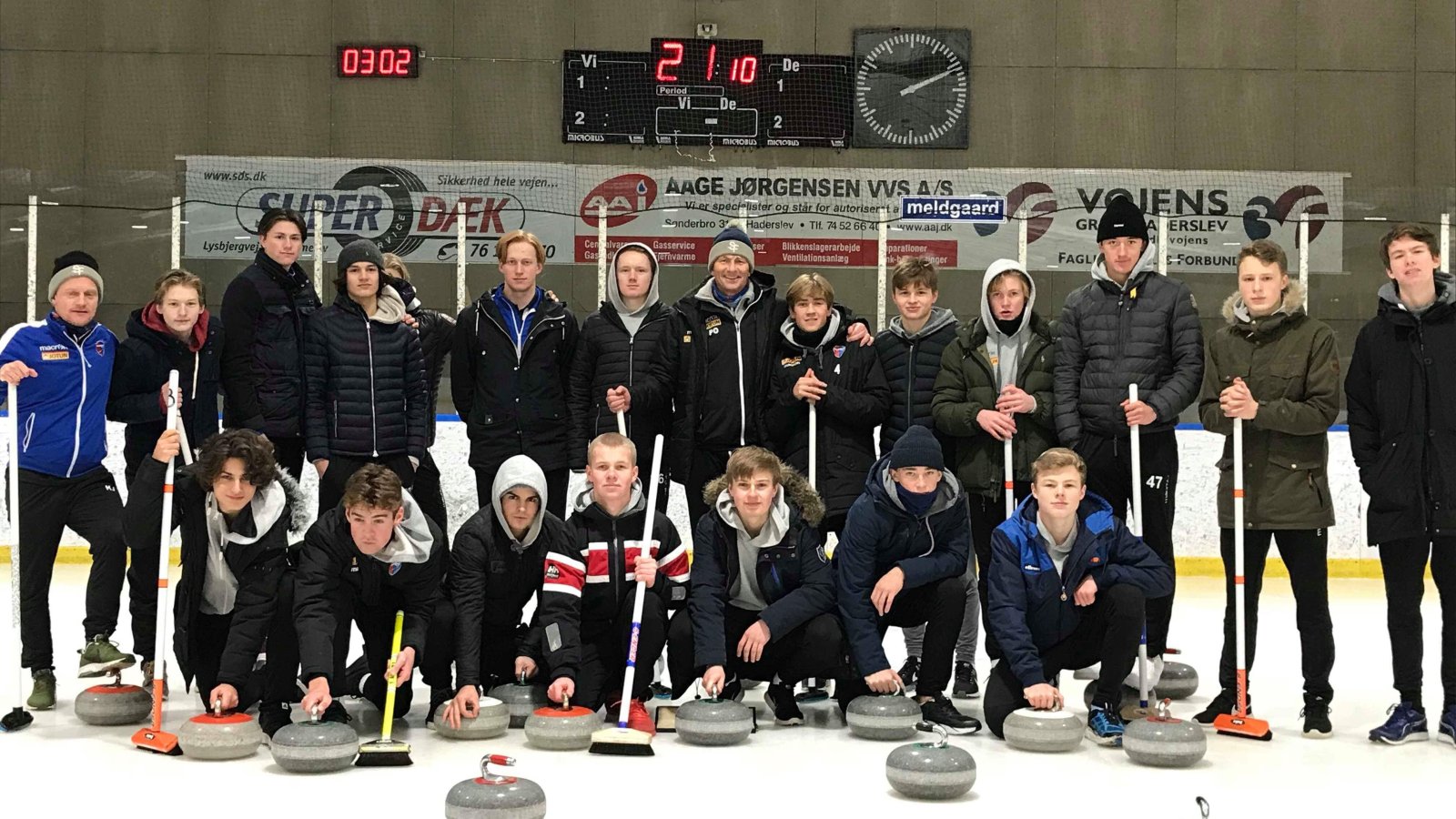 Kvart på syv gikk gutta igjen ombord på bussen. Destinasjonen var SE Arena. Nå skulle det curles. Petter delte gruppa inn i fire lag som skulle kjempe om premien. Etter en haug med instruksjoner på dansk, var det tid for å prøve denne mystiske sporten. Det viste seg fort å være vanskeligere enn de fleste hadde antatt, og lyden av mennesker som skled på isen fylte hallen.