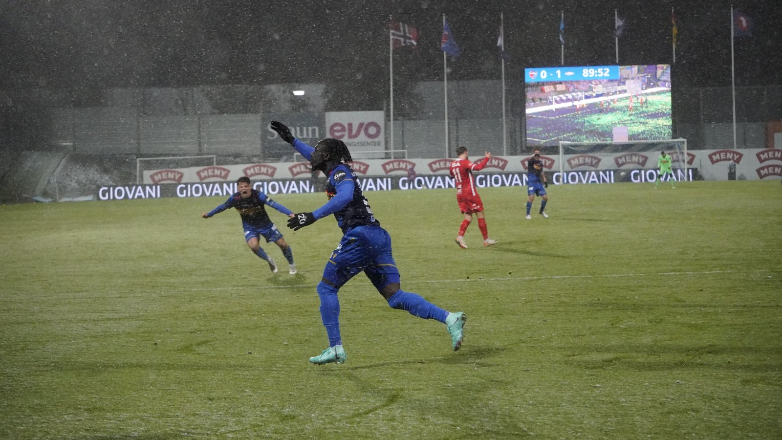 Og Franklin var nesten euforisk i snøføyka da han ble intervjuet av TV2s reporter etter sin scoring. - Det var en nydelig scoring under praktfulle forhold. Han er trønder og liker seg i vintervær. - Det var et ufattelig viktig poeng for oss. Det gir selvtillit. Og det gir oss en form for kontakt med lagene foran oss på tabellen. Vi kan lese - selv om vi forsøker ikke å ha altfor stort fokus på vår posisjon i bunnen. Jeg er imponert over at publikum kom i dette været. Og jeg ønsker dem alle tilbake når vi skal spille mot Rosenborg i neste hjemmekamp. Franklin Daddys Boy Nyenetue gjorde et fantastisk innhopp. Og scoret da laget, byen og hele Vestfold trengte en oppmuntring.