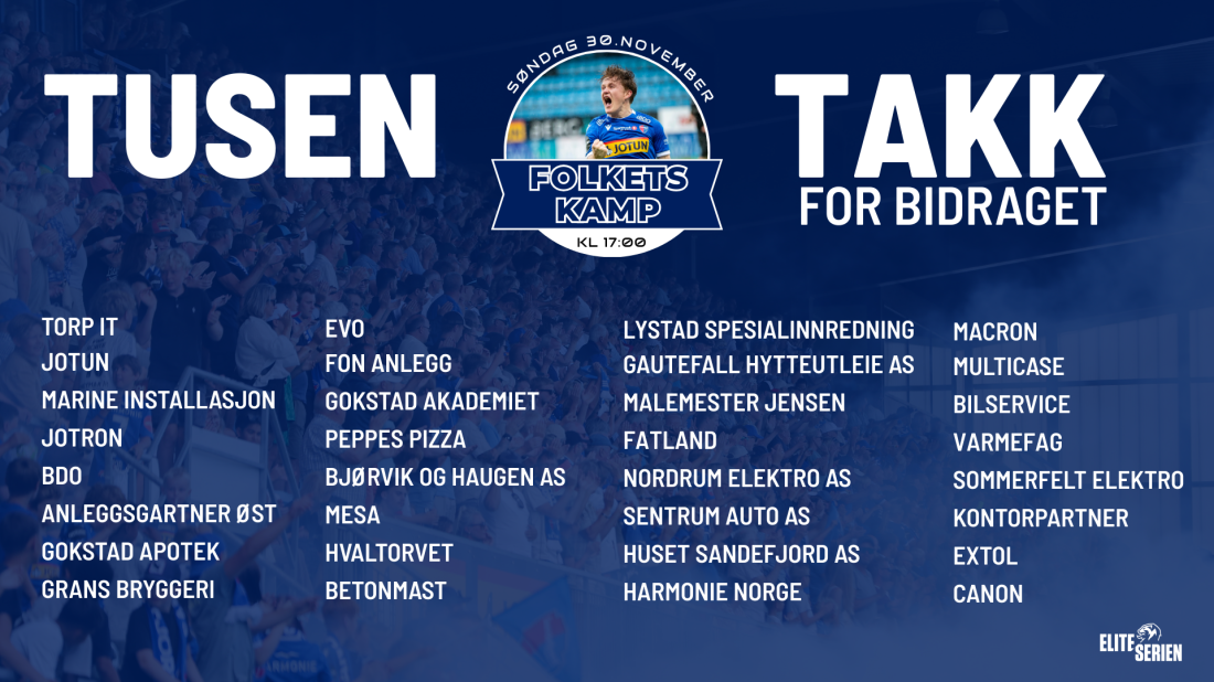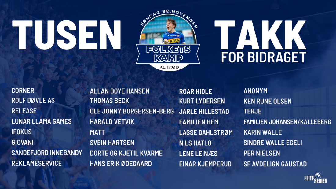 Årets siste hjemmekamp er fullført, dette var som kjent Folkets Kamp hvor næringslivet og privatpersoner kunne bidra med et bidrag per tilskuer, eller et fast beløp. Vi er utrolig takknemlige for alle bidrag som kom inn.